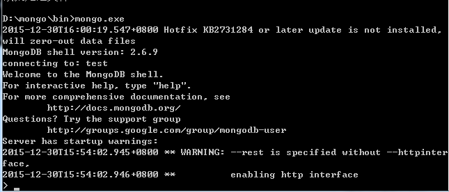 定位到D:\Program Files \mongodb\bin,使用mongo.exe进入mongodb的命令行管理。